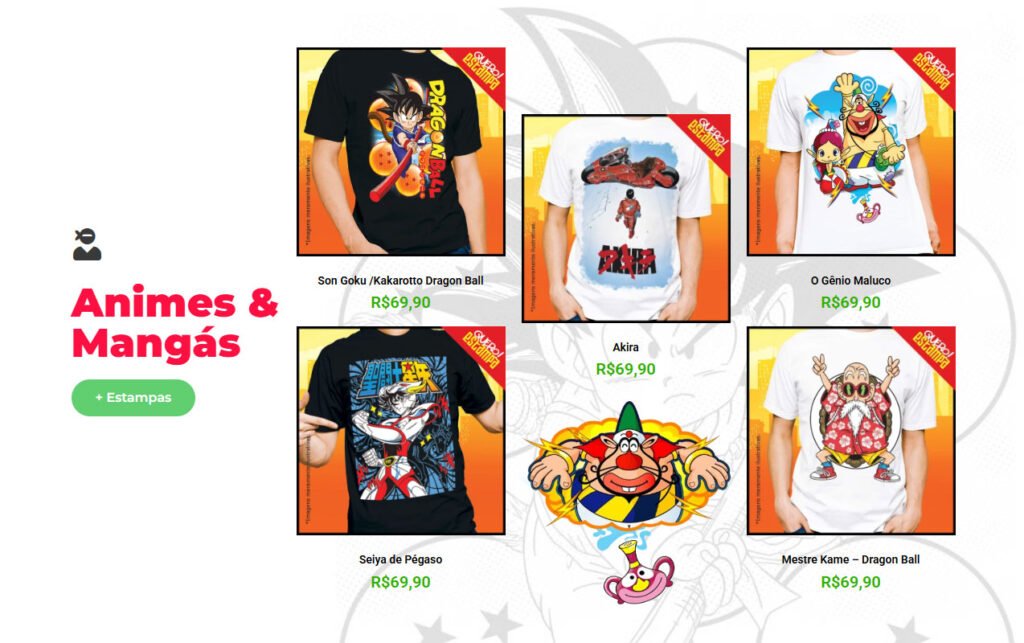- Paleta de Cores e Contraste: Optamos por um fundo limpo que permite que as artes das estampas (o verdadeiro produto) se destaquem. O uso estratégico de banners dinâmicos com tipografia de impacto remete à estética de cartazes de filmes e HQs.