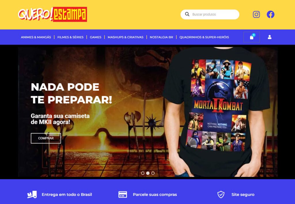 A Quero Estampa não vende apenas camisetas; ela vende conexões com a cultura pop, animes, games e cinema. O desafio visual era criar um ambiente que conversasse com o público geek sem parecer poluído.