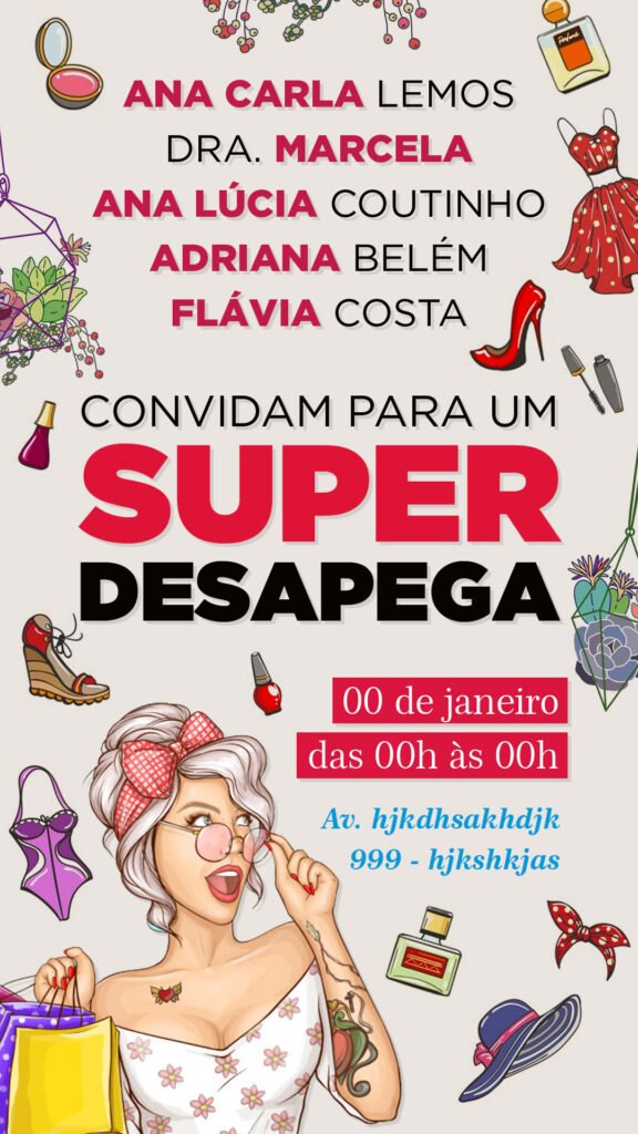 - Ilustração de Destaque e Tema: O coração da arte é a ilustração central de uma mulher estilosa, com ares de pin-up moderna, cercada por itens de moda e beleza. Isso não só chama a atenção imediatamente, mas também contextualiza perfeitamente o tema do evento (“Desapega” – venda/troca de itens usados), criando uma conexão instantânea com o público-alvo.